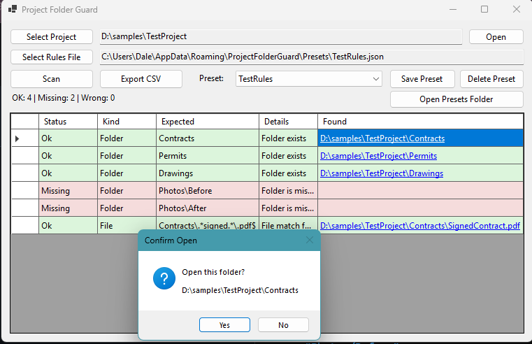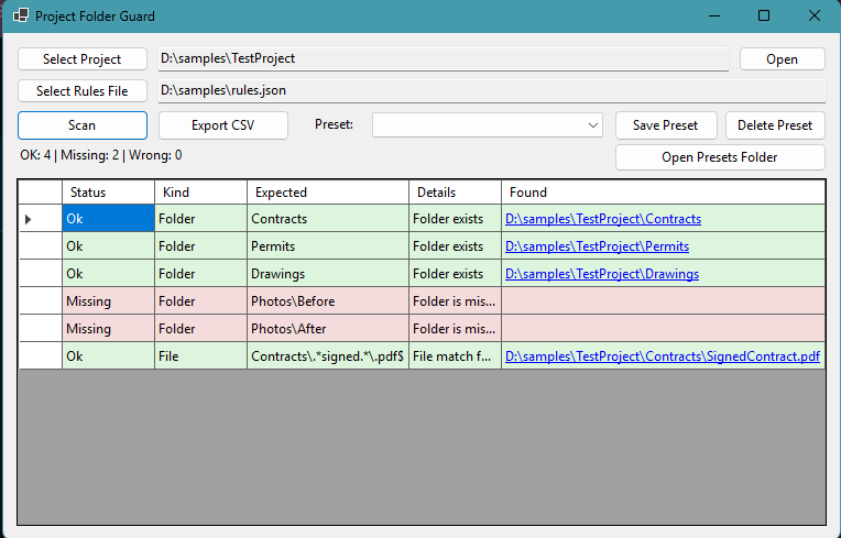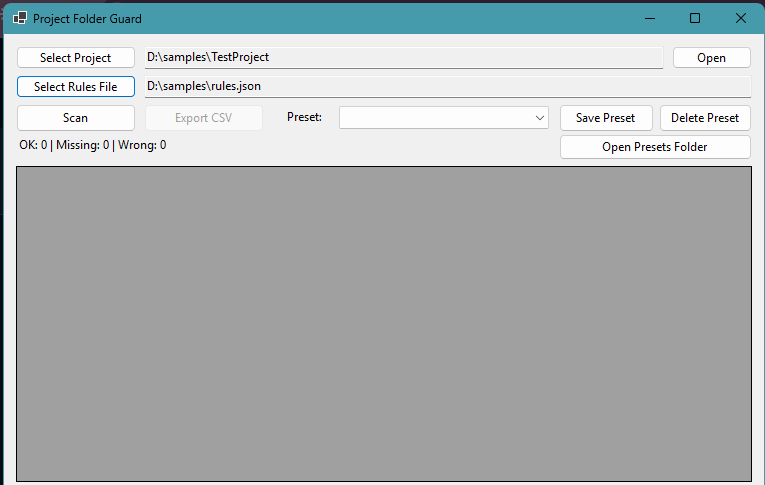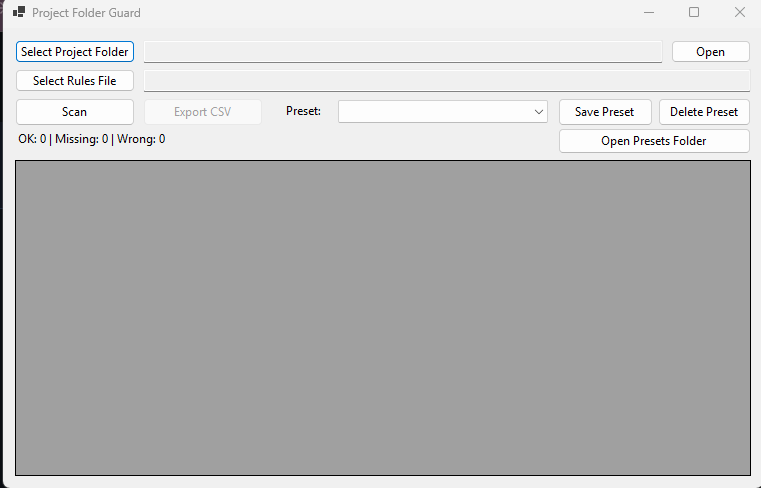 Project Folder Guard is a Windows desktop utility designed to validate project folder structures against configurable rules. It is built for real-world scenarios such as construction workflows, document compliance, and internal auditing processes.